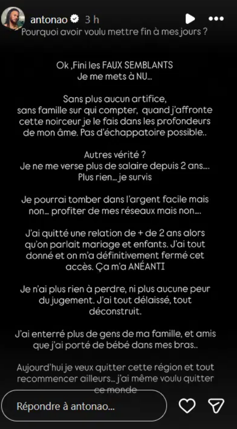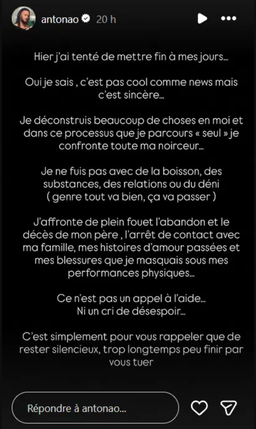 Dans plusieurs stories publiées sur son compte personnel, Anthony Amar a choisi de se livrer sans filtre. Il y écrit avoir tenté de mettre fin à ses jours, une déclaration d’une brutalité rare. Une phrase choc, posée sans détour, qui tranche avec l’image publique du sportif solide et souriant, et qui a immédiatement suscité une vague de réactions.